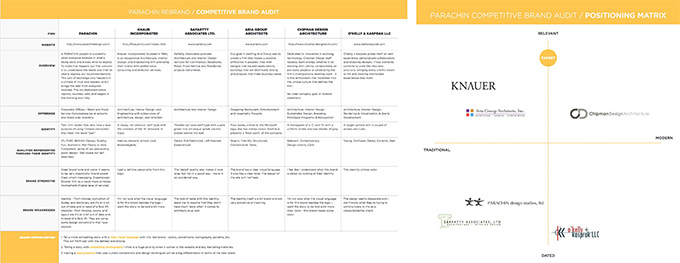 左側(cè)為競爭對手評估,右側(cè)為定位模型。兩者均為分析 Parachin Design Studios 的市場評估。