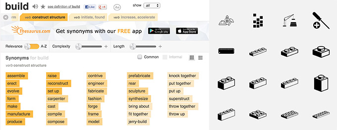 我通常先從同義詞為發(fā)散點(diǎn),我會(huì)使用直觀的同義詞詞典 thesaurus.com 或是視覺同義詞庫 The Noun Project。剖析項(xiàng)目簡報(bào)中的關(guān)鍵詞,找到其更豐富的含義,可能是一小段演說詞,也可能是流行語句或成語。
