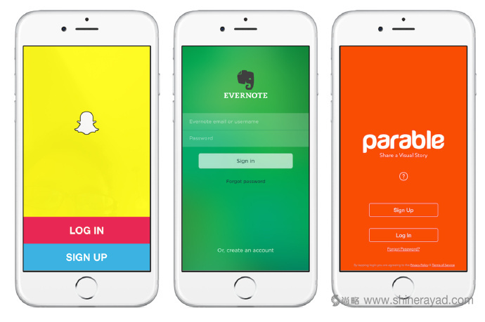 顏色方案決定了應(yīng)用的形象,它應(yīng)該是品牌主題色的擴展。它是視覺設(shè)計的核心,因為應(yīng)用所有可見的地方都會使用這些顏色。首先,你需要選擇一個能增強品牌形象的主題色。例如,Evernote的主題色是綠色。然后,你應(yīng)該圍繞這個主題色來創(chuàng)建顏色方案。亮色可以吸引人的目光,所以適合那些消費導(dǎo)向的應(yīng)用;中間色可以讓人把精力集中在信息本身,所以更適合專業(yè)性的應(yīng)用。Parable的主題色是“Tangelo橙”,因此我們選擇了灰度作為主要顏色方案,這也符合我們一貫的時尚創(chuàng)意。另一個例子是SnapChat,它使用了華麗的亮色方案來吸引青少年用戶。