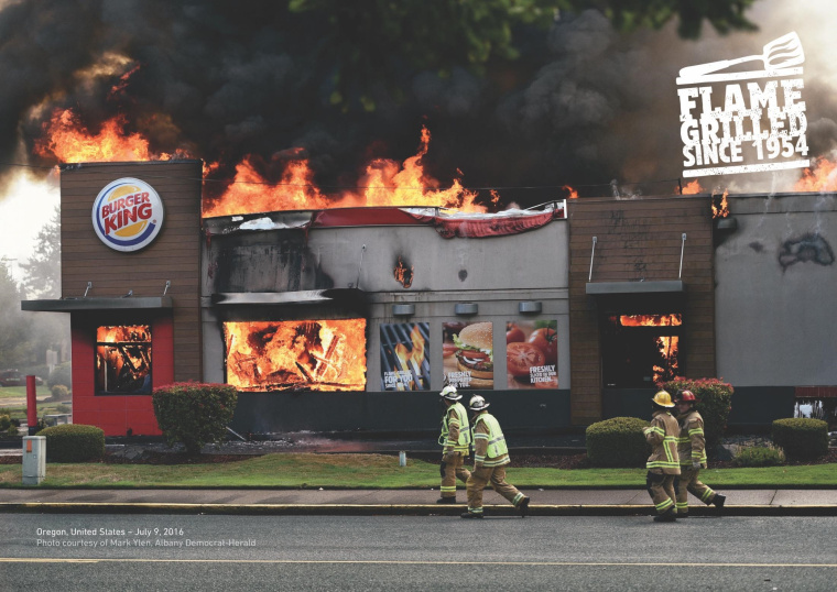 尚略廣告策劃設計公司分享的這則廣告宣傳的是漢堡王的火焰燒烤技術,采用夸張的手法凸顯店家的技術賣點,以火災現(xiàn)場作為圖片選擇,既具有話題性又有色彩感,十分吸人眼球,并用上1954這個數(shù)字,告知了消費者本店的燒烤技術由來已久,經(jīng)過不斷的改良提升才發(fā)展至此,無形中提升了消費者對漢堡王品牌的信任度。