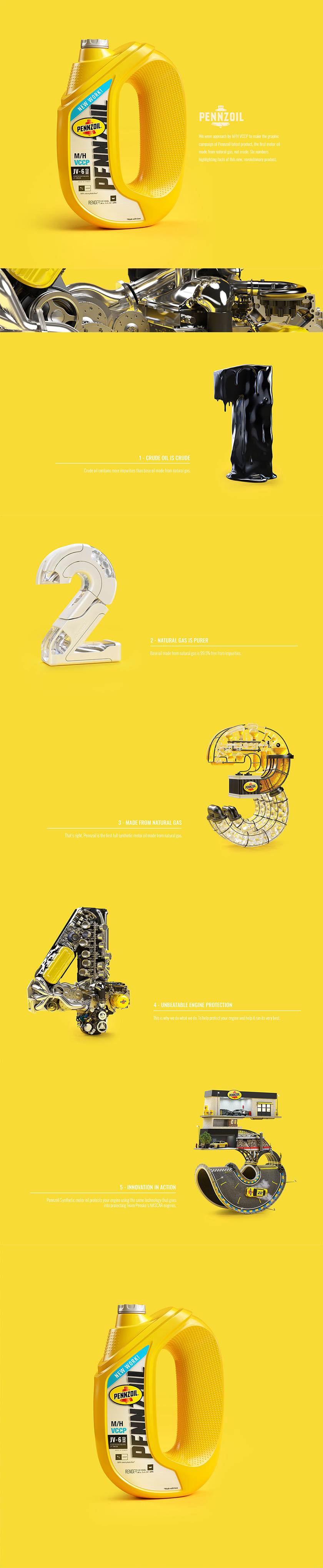廣告設(shè)計(jì)公司與M/H VCCP公司接洽,制作設(shè)計(jì)了Pennzoil最新潤滑油產(chǎn)品的圖形廣告,這是第一種由天然氣而非原油制成的潤滑機(jī)油。六個(gè)數(shù)字突出了這個(gè)革命性的新產(chǎn)品的事實(shí)。