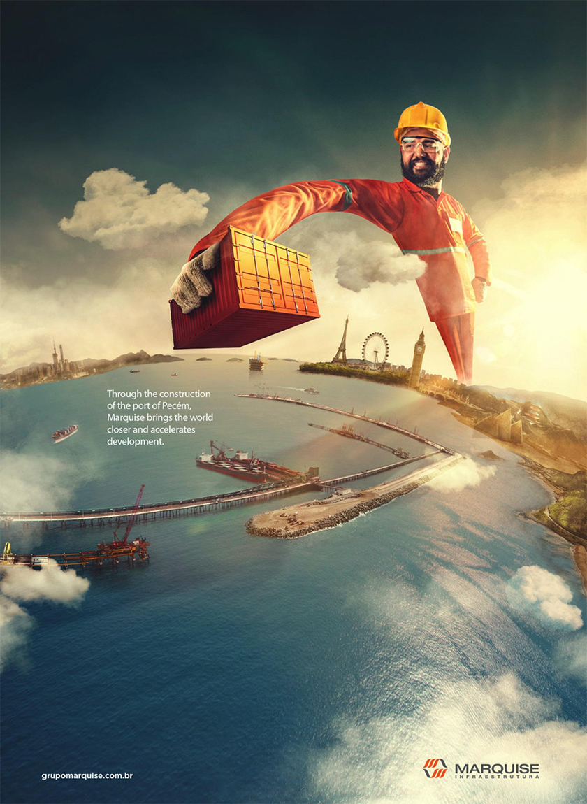 由Bravo / BBG廣告公司,為侯爵夫人集團(tuán)(Marquise Group)創(chuàng)建的平面廣告創(chuàng)意設(shè)計(jì),以慶祝巴西東北部的Porto do Pecem佩切姆港開通。廣告設(shè)計(jì)作品用一個拿著集裝箱的超長拉伸的手臂,環(huán)繞地球來表現(xiàn)拉近世界,廣告畫面非常有創(chuàng)意和視覺美感。