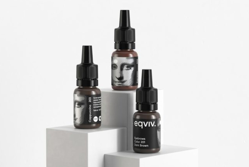 這些畫中的女主人公成為包裝上的主要人物。基于這些以半色調(diào)樣式繪制的圖像的插圖反映了應(yīng)用針扎成的永久性化妝的過程。在每個(gè)包裝和瓶子上,圓點(diǎn)表示永久性涂漆的區(qū)域。