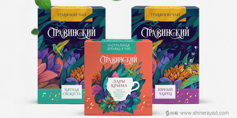 在俄羅斯,為了給家人帶來健康和美味的食物,健康意識(shí)的女性被選為Stavinsky的目標(biāo)受眾。聚焦于情感,Stavinsky顯得愉快和夢(mèng)幻,幾乎就像喝它創(chuàng)造了一個(gè)優(yōu)越的狀態(tài)。豐富的深色調(diào),封面包裝,使花卉,藥材,甚至在每個(gè)茶盒前蜂鳥來生活。斯特拉文斯基的品牌名稱是寫在一個(gè)童話般的字體,有些字母循環(huán),創(chuàng)造精致的設(shè)計(jì)。小細(xì)節(jié)不被忽視,試圖將茶分開,從小葉子,看起來像音樂的音符將一些植物和動(dòng)物的條形碼。