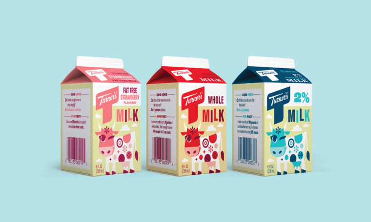 這種牛奶包裝設計帶來了興奮的乳品感覺。Josh Emrich包裝設計公司設計了Turner Dairy Farms牛奶的樂觀包裝,其中包括針對加侖,紙箱甚至兒童的迷你紙箱的更新設計。