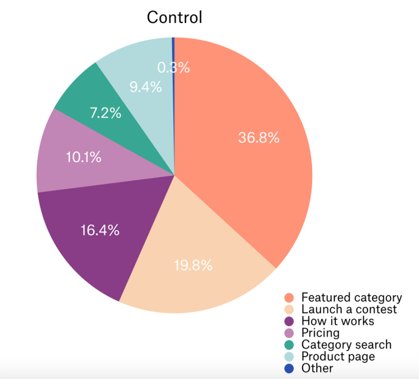我們測試了新版主頁,添加了一個關(guān)于我們客戶的視頻和副本,并將其與我們的原始版本(控件)進行了比較。我們發(fā)現(xiàn)帶有視頻的版本將更多流量重定向到我們的精選類別頁面,但遠離我們的啟動頁面,這是我們的一個關(guān)鍵轉(zhuǎn)換頁面?;氐嚼L圖板。