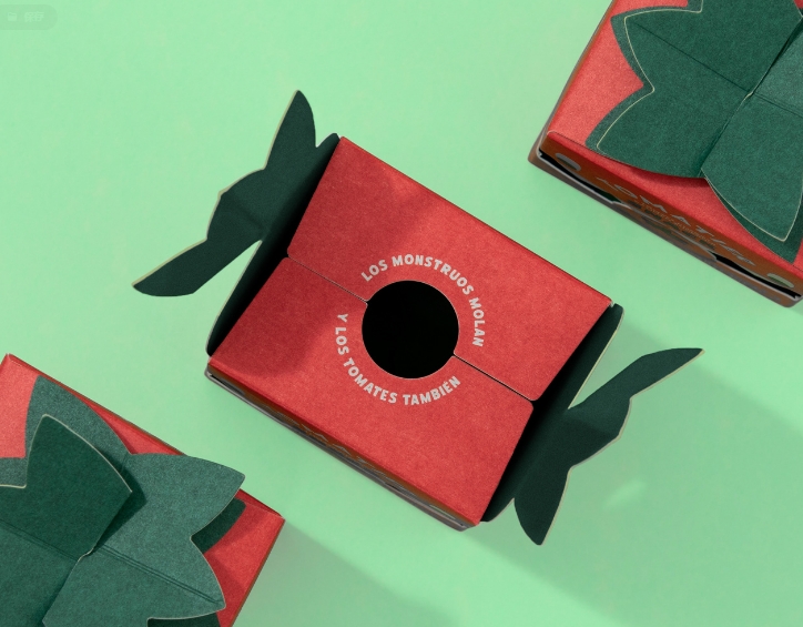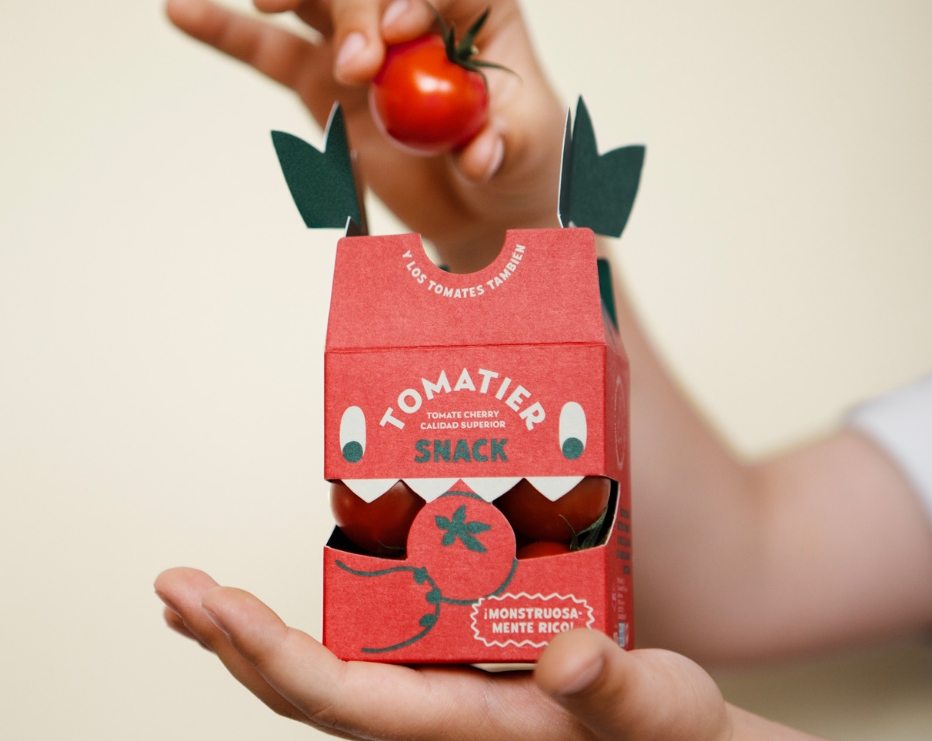 誰(shuí)說(shuō)吃西紅柿很無(wú)聊,而且只適合成年人吃?包裝設(shè)計(jì)公司的建議是將一盒8-10個(gè)櫻桃番茄的訂單轉(zhuǎn)化為一個(gè)有趣的解決方案,提供講故事的機(jī)會(huì)來(lái)發(fā)展溝通。這是關(guān)于一個(gè)可愛(ài)的怪物,他喜歡吞噬西紅柿,甚至有了自己的外表。他的嘴上的鬼臉是讓你看到里面產(chǎn)品的窗戶(hù),而他形狀像番茄莖的徽章將起到特殊的閉合作用。